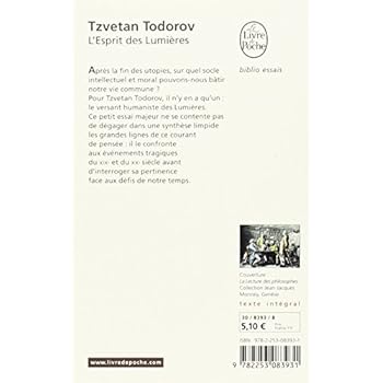 Tzvetan Todorov nous narre l'origine des Lumières au 18ème siècle. Il nous détaille tout au long de l'ouvrage, les fondamentaux dont-elles sont constituées, tels que :- Le droit essentiel de tout être humain à la vie ;- La démocratie et la laïcité ;- La tolérance ;- Le respect de la liberté individuelle de conscience et d'esprit critique par l'éloge de la Connaissance ;- L'égalité Universelle des droits des hommes et des femmes entre eux et face à la loi ;- L'égalité entre les Peuples ;- Etc..L'auteur dénonce les dérives et détournements de l'Esprit des Lumières à des fins dogmatiques, idéologiques, utopiques par certains individus, pays, régimes politiques, religions...En effet, Tzvetan Todorov nous démontre, par exemple, que le Colonialisme aux 19ème et 20ème siècles, est une de ces dérives, pages 29 et 30 :"L'un des reproches habituels qu'on adresse aux Lumières est qu'elles ont fourni les fondements idéologiques du colonialisme européen du XIXe et de la première moitié du XXe siècle. Le raisonnement est le suivant : Les Lumières affirment l'unité du genre humain, donc l'universalité des valeurs. Les Etats européens, convaincus d'être porteurs de valeurs supérieures, se sont cru autorisés à apporter leur civilisation aux moins favorisés qu'eux ; pour s'assurer de la réussite de leur entreprise, ils ont dû occuper les territoires où habitaient ces populations..."L'autre dérive concerne bien évidemment, les deux grands régimes Totalitaires du 20ème siècle : le Communisme et le Nazisme, page 33 :"Un autre reproche particulièrement grave adressé à l'esprit des Lumières est d'avoir produit, quoique involontairement, les totalitarismes du XXe siècle, avec leur cortège d'exterminations, d'emprisonnements, de souffrances infligées à des millions de personnes. L'argument se formule ici à peu près en ces termes : ayant rejeté Dieu, les hommes choisissent eux-mêmes les critères du bien et du mal. Enivrés par leur capacité de comprendre le monde, ils cherchent à le remodeler pour le rendre conforme à leur idéal ; ce faisant, ils n'hésitent pas à éliminer ou à réduire en esclavage des portions importantes de la population du globe."En conclusion, l'Esprit des Lumières sert souvent iniquement à "justifier" les barbaries du passé et d'éventuelles futures déviances de l'être humain.Il ne faut pas confondre la fondamentale égalité entre les Hommes, et le soi-disant "Scientisme" idéologique qui, lui, est un danger pour la liberté individuelle et des Nations, au profit : des opportunistes extrémistes et pseudo-"sauveurs" de l'humanité en tous genres.Confer également d'autres ouvrages aussi passionnants, de Tzvetan Todorov :- Mémoire du mal, Tentation du bien : enquête sur le siècle ;- Le Nouveau Désordre mondial : Réflexions d'un Européen ;- Face à l'extrême ;- La Peur des barbares : Au-delà du choc des civilisations ;- Les Abus de la mémoire.